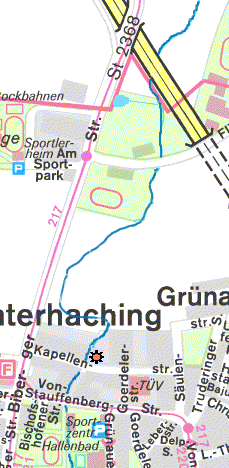 Unterhaching. Kapellenstr. 14 Sägemühle. Ehemalige dampfbetriebene Säge- und Getreidemühle. 1850 erbaut, 1910 abgebrannt, heute steht an der Stelle ein Wohnhaus. Ableger der Untermühle. |