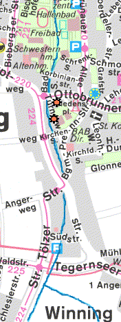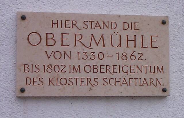 Unterhaching. Hauptstr. 69 Obermühle (1330-1862) (siehe Hinweistafel) 1865 wird die baufällige Mühle ca. 250m weiter südlich verlegt, "Bäckermühle" (Bäckerei Kiermaier) |